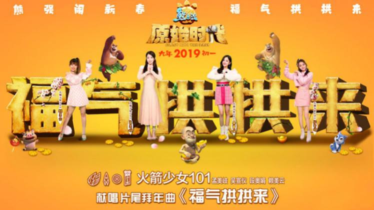 1月16日,新生代女子團體火箭少女101與最強口碑賀歲動畫電影《熊出沒?原始時代》強強聯合,由火箭少女101成員孟美岐、吳宣儀、段奧娟、賴美云合體獻聲的電影片尾曲《福氣拱拱來》在酷狗音樂正式上線。看火箭少女帶領大家一起元氣滿滿喜迎2019新年到!火箭少女101的這首..