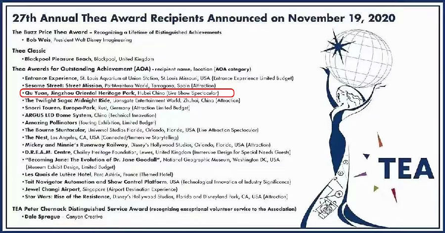美國當地時間11月19日,國際主題娛樂協會(TEA)公布了第 27 屆 Thea 大獎名單,華強方特集團旗下荊州方特東方神畫主題樂園的大型真人演藝特效劇場項目——《屈原》榮獲2020年度“杰出成就獎”。