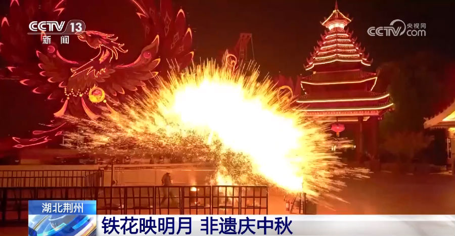 中秋期間,荊州方特東方神畫圍繞傳統節日打造“中秋奇妙夜”系列特色活動,引入國家級非物質文化遺產打鐵花、火壺秀的同時,更有點點魚燈組成的盛大花車巡游、千架無人機和煙花組成的大型煙花詩劇等將傳統文化和現代科技創新結合的演藝形式,營造出滿滿的節日氛圍感。在央視節目報道中,受訪游客表示:“打鐵花看得蠻震撼人心的,你看這邊建筑上有古詩,還有月亮,還有玉兔,可以教會小朋友很多中國傳統文化的知識。”