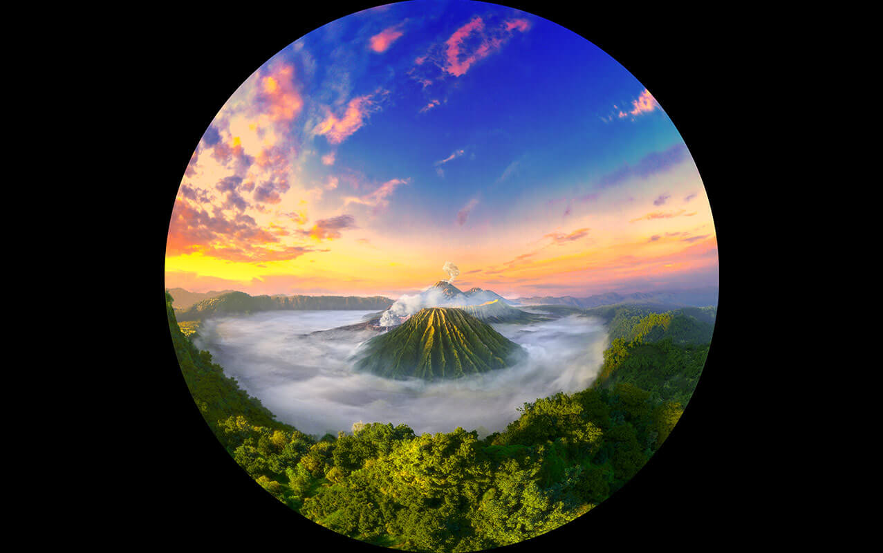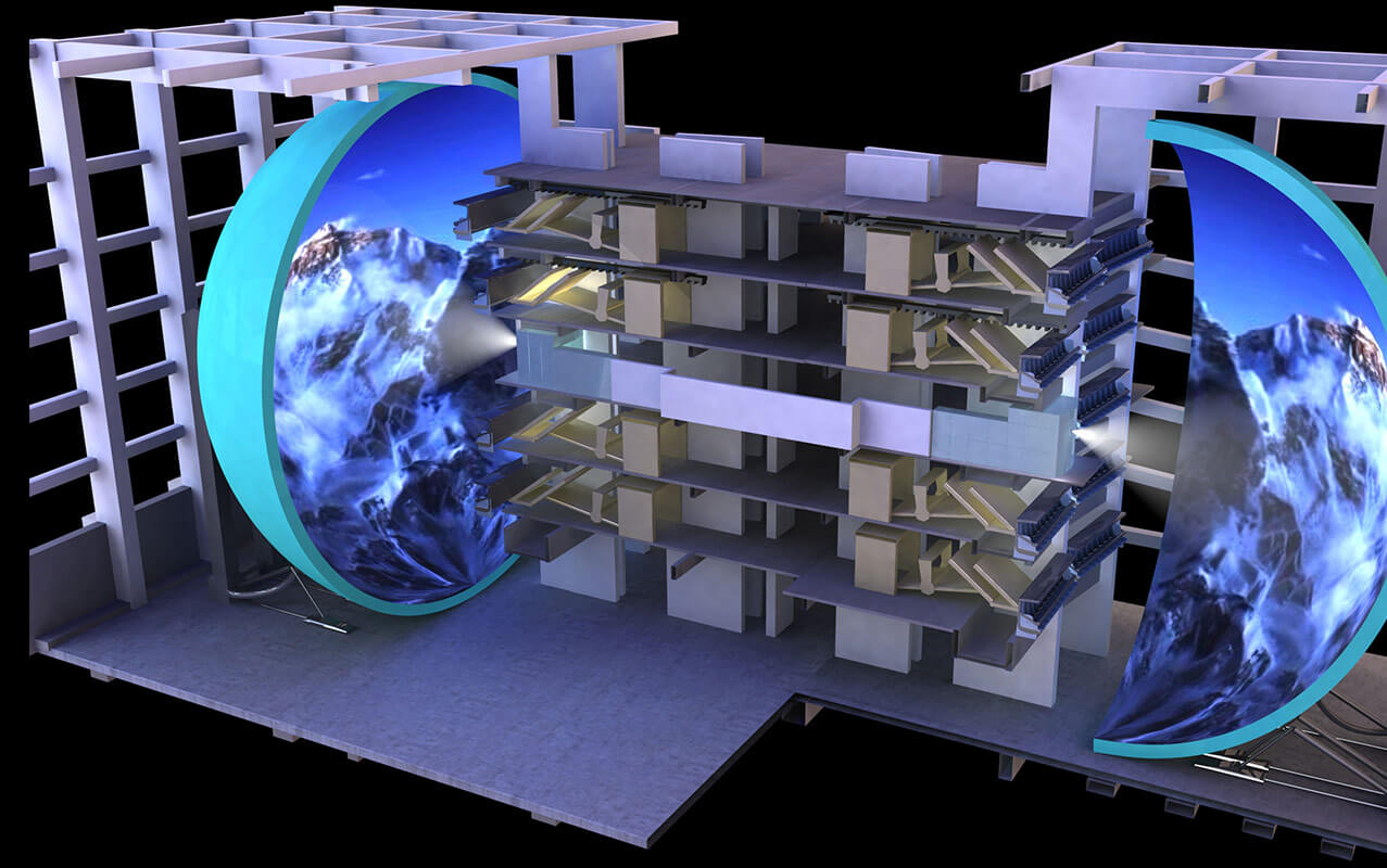 球幕投影系統(tǒng)包含高清晰度球幕設計、高清晰度投影系統(tǒng)設計以及大張角魚眼鏡頭設計等幾部分。球幕影院屏幕呈半球形,游客被包圍其中,給游客無邊界,接近真實的視覺感受。結合懸掛式行模擬器座椅模擬影片鏡頭運動,為游客創(chuàng)造出良好的觀影效果。