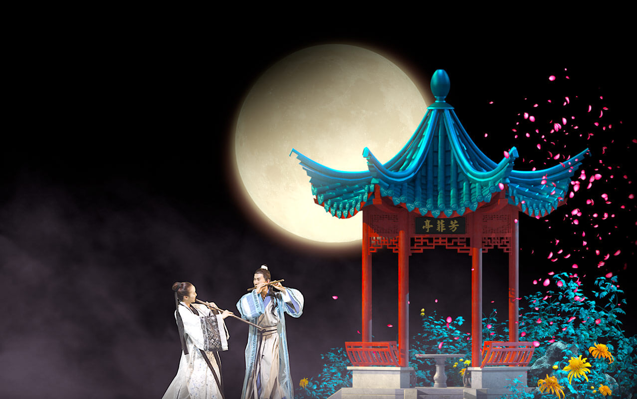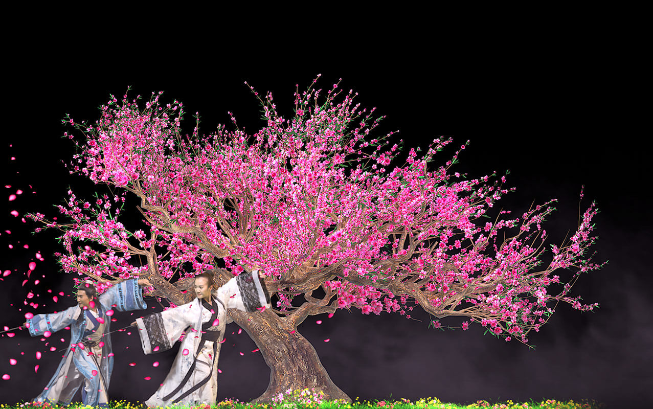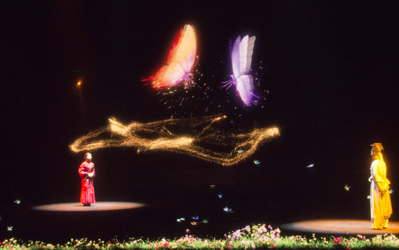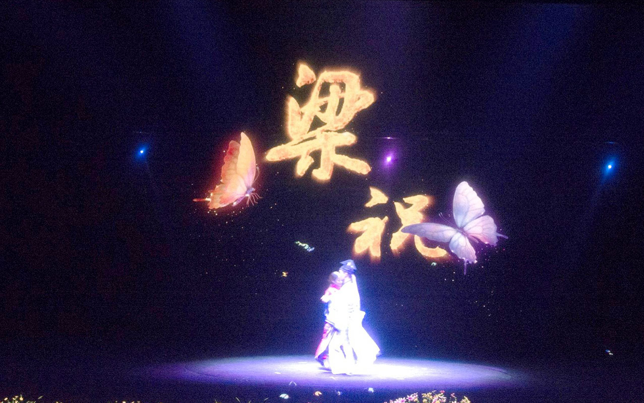 全景式AR環(huán)境影片《梁祝》,打破傳統(tǒng)歌舞劇場(chǎng)的表演形式,把真人表演與幻影成像相結(jié)合。以《梁山伯與祝英臺(tái)》的愛(ài)情故事為基礎(chǔ),精彩演繹祝英臺(tái)女扮男裝上山求學(xué),與梁山伯暗生情愫,最后為追尋真愛(ài)而殉情,兩人雙雙化蝶的經(jīng)典橋段 。實(shí)現(xiàn)了四面墻在通透的舞臺(tái)上憑空出現(xiàn),藤蔓在墻上生長(zhǎng),以及墻面碎裂、崩塌甚至消失等神奇效果。