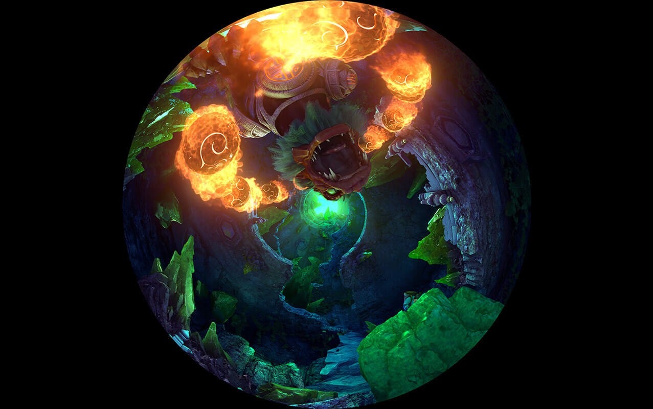 室內升降式穹頂影院主演廳分為兩層,通過大型旋轉升降式平臺連接。一層為多媒體實景舞臺,多種銀幕與實景相結合,二層為穹頂式球幕表演。根據劇情發展帶領觀眾乘坐超大型提升平臺從一層提升到9米高的二層觀影平臺,結合多種高科技表現手段,創造出震撼的動感體驗。